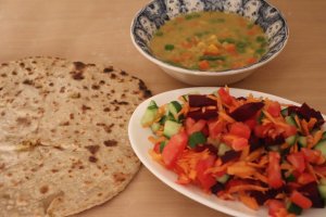 ايدام عدس مع خضار مجمدة بالكاري + باراتا بالبصل ( صحية ) سلطة ( شمندر + جزر + خيار + طماطم مع خل ابيض وملح بحري و ليمون )
