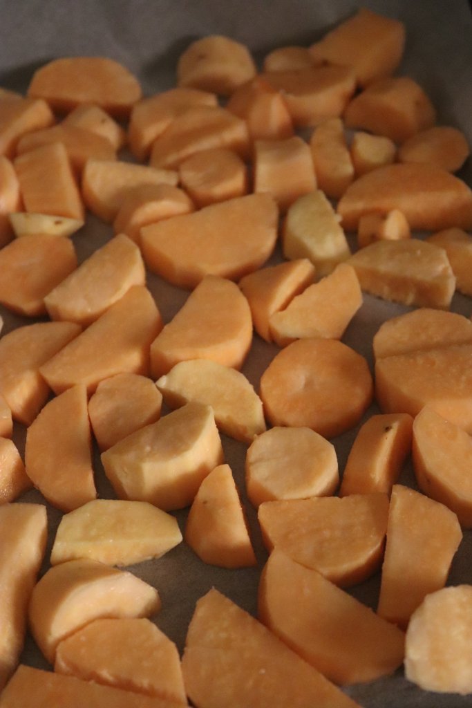البطاطا الحلوة غسلتها وقشرتها.. بعدين قطعتها قطع كبيرة ( عملت كمية لليوم ويومين زيادة ) تبلتها بشوية ملح وقسمتها جزئين جزء اضفت له بودرة بصل